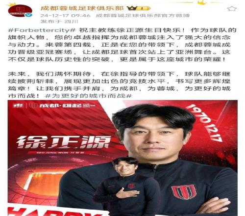北京时间12月17日,成都蓉城主教练徐正源迎来55岁生日,但值得玩味的是,成都蓉城官方没有像过去几年那样,给徐正源送上祝福的海报。